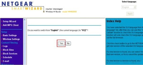 3、刚进入管理界面时它会问是否需要将英文改为中文,点击“YES”。(WNR2000 支持多国语言包,在右上角可以进行选择)
